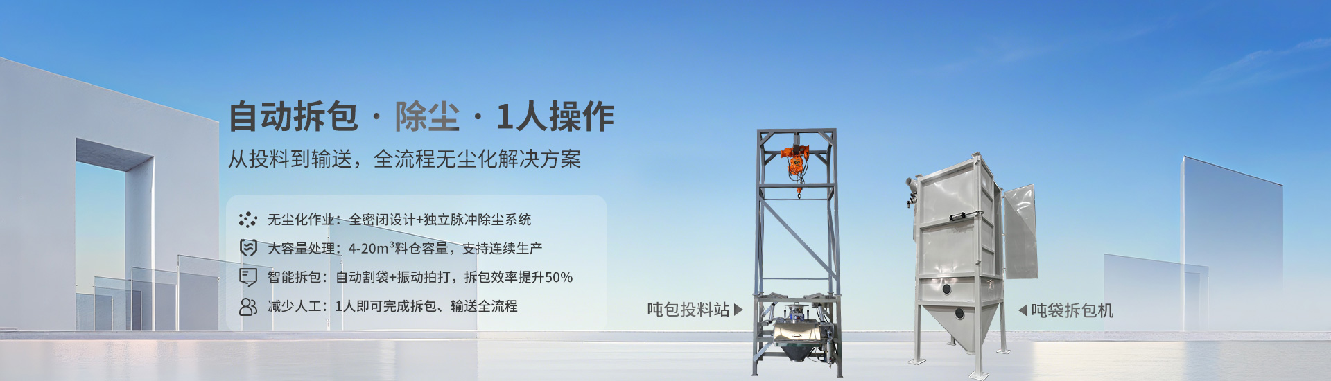 吨袋拆包站通过电动葫芦或桁架机器人将吨袋吊运至指定位置,随后借助设备自身的装置(如割刀、拍打机构等)对吨袋进行拆解。割刀能划破吨袋的出料口,使物料依靠重力下落,而拍打机构则可对吨袋进行拍打,确保袋内物料充分卸出,有效避免物料残留。