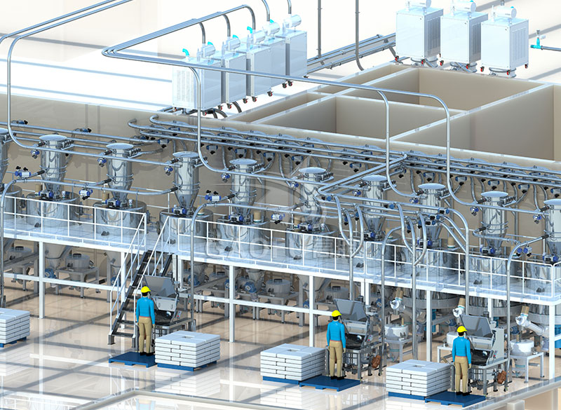 专业设计团队,提供输送参数,输送过程物料损耗小。 | 全密闭式管道输送,无尘、不易泄露,保证车间整洁。 | 自动化程度高,省时,省力,生产效率高。 | ||