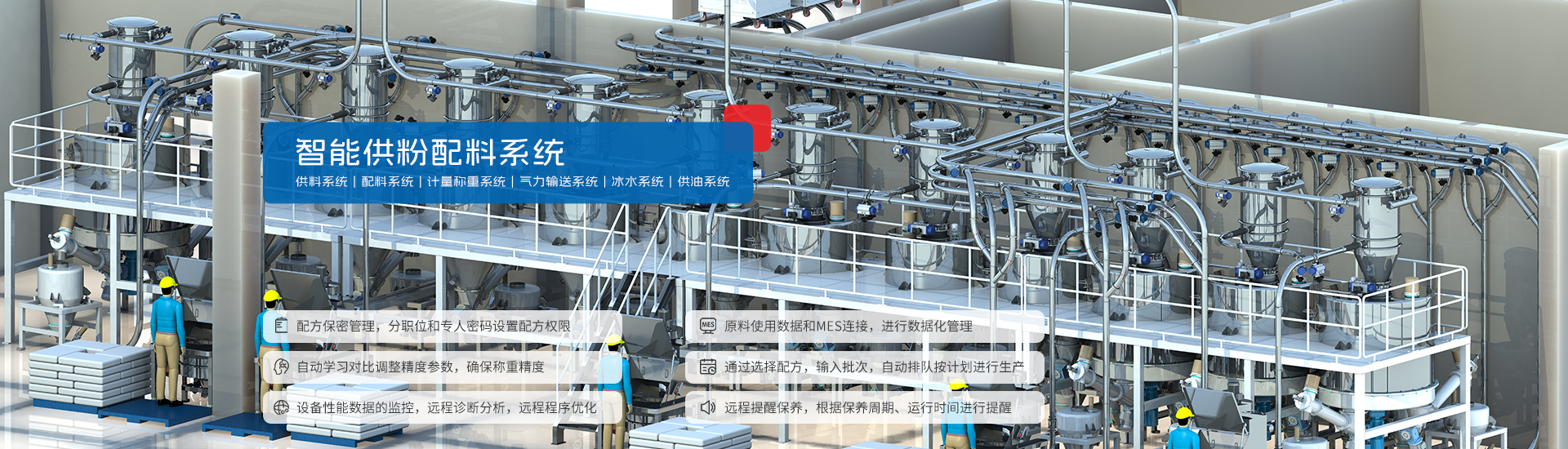 每条生产线仅需1-2人值守,减少劳动力,降低人力成本。 | 运行稳定,不堵漏,结构简单,易维护。 | 计量配料精度高达3‰,提升产品的品质,降低不良品的比率。 |